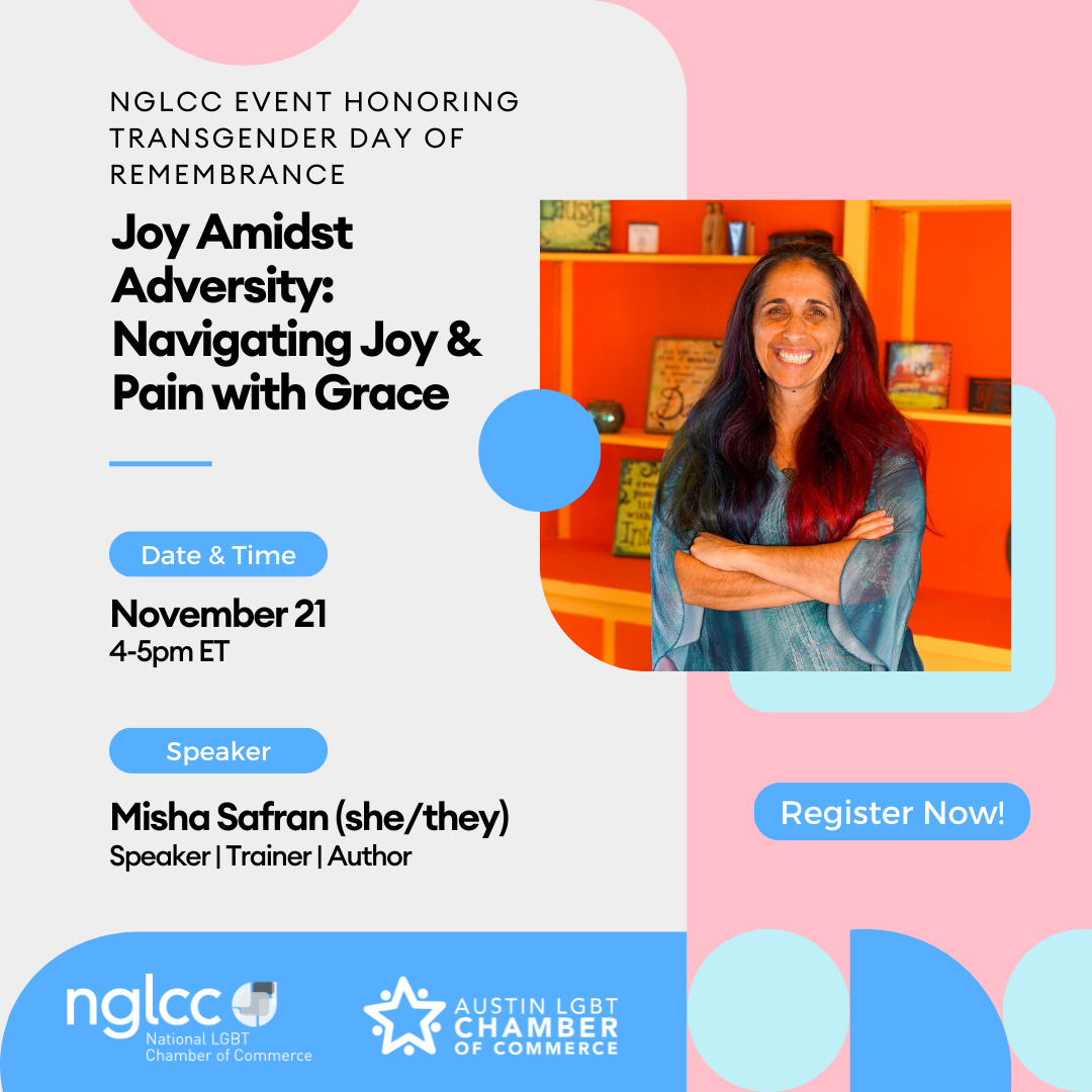 Join the NGLCC TGX Initiative, the greater NGLCC community, and the Austin LGBT Chamber of Commerce as we honor this year's Transgender Day of Remembrance by hosting “Joy Amidst Adversity: Navigating Joy & Pain with Grace” with Misha Safran. Misha (she/they) is the founder of NGLCC Certified LGBTBE® The Center for Empathy and Emotional Intelligence (CEEQ), which focuses on how empathy and emotional awareness enhance relationships at home, work, and in communities.