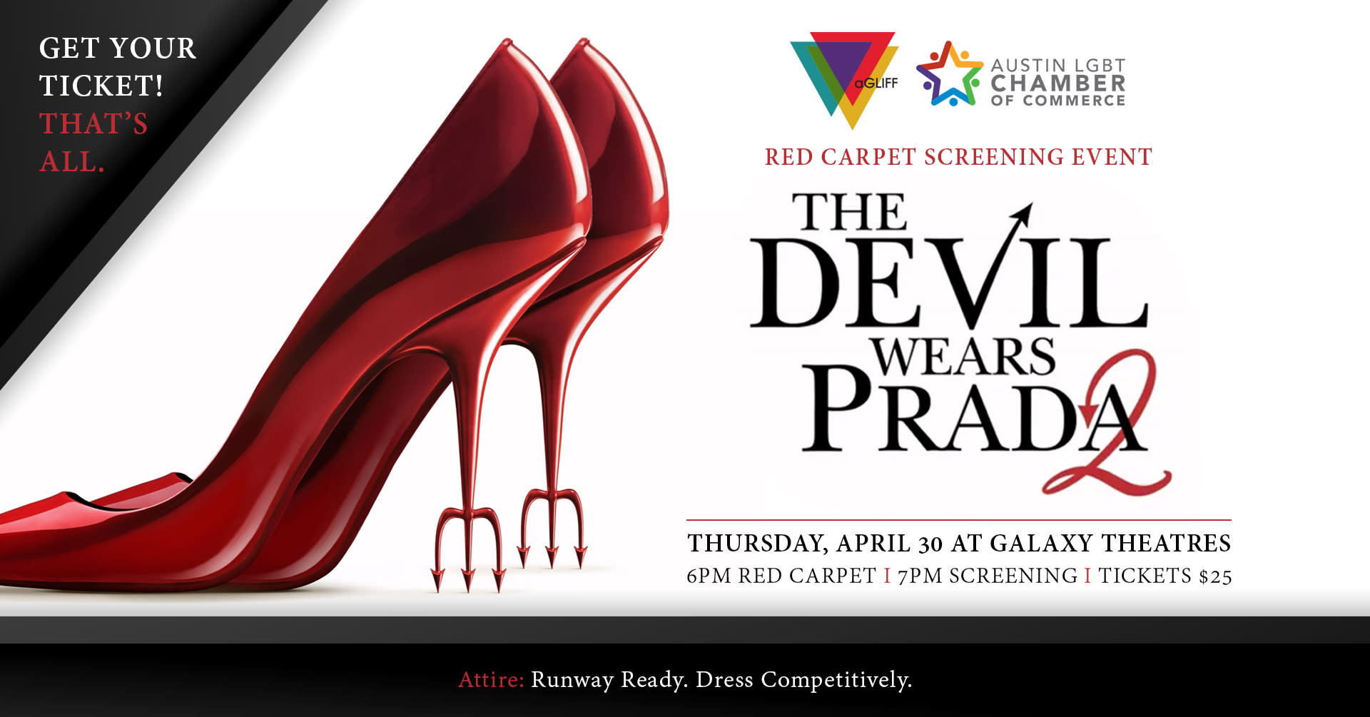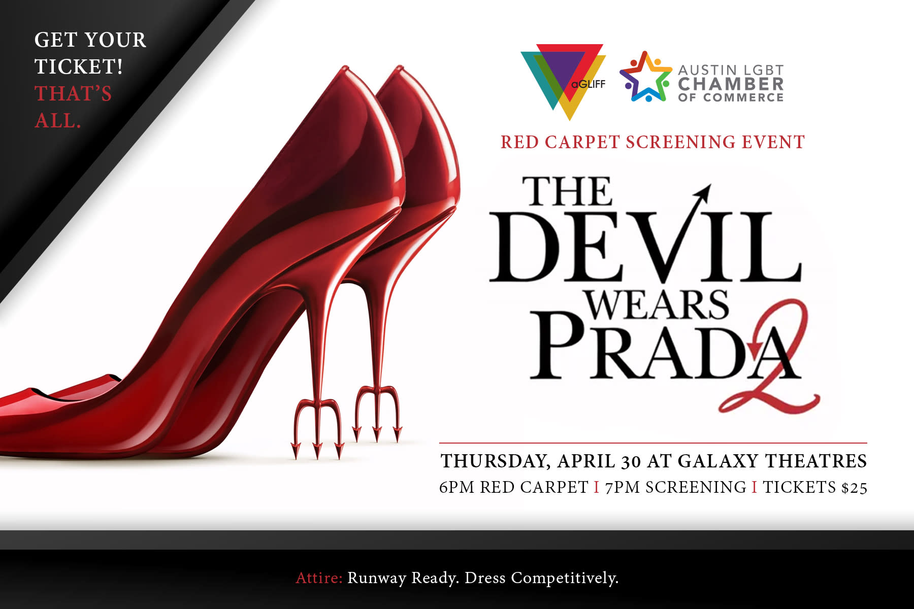 aGLIFF, in partnership with the Austin LGBT Chamber of Commerce, invites you to a Runway-Inspired Red Carpet Screening of The Devil Wears Prada 2—an unforgettable evening of fashion, film, and fierce self-expression.