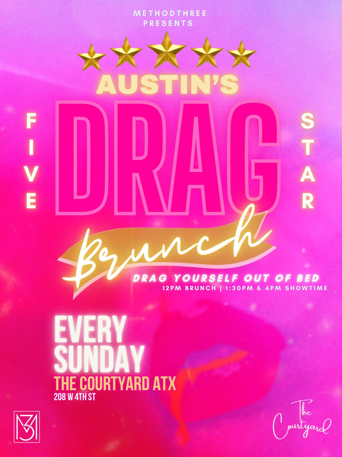 We’re SO ready for 𝘼𝙐𝙎𝙏𝙄𝙉’𝙎 ⭐️⭐️⭐️⭐️⭐️ 𝘿𝙧𝙖𝙜 𝘽𝙧𝙪𝙣𝙘𝙝 this Sunday, are you!? So Drag yourself out of bed, each and EVERY Sunday at The Courtyard ATX, brought to you by Method Three Events 🌤️