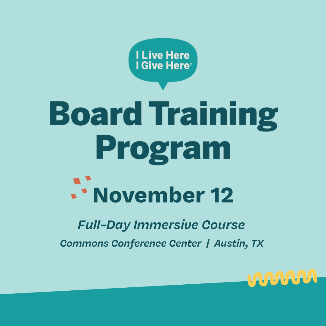 Chamber members get $25 off!!! Your personal and professional skills can be a force for good. I Live Here I Give Here’s Board Training Program is a full-day immersive course designed to prepare individuals who are interested in taking on board service at a nonprofit organization. This year’s program will take place on Tuesday, November 12 from 9 am - 5 pm at the UT Commons Conference Center in North Austin.