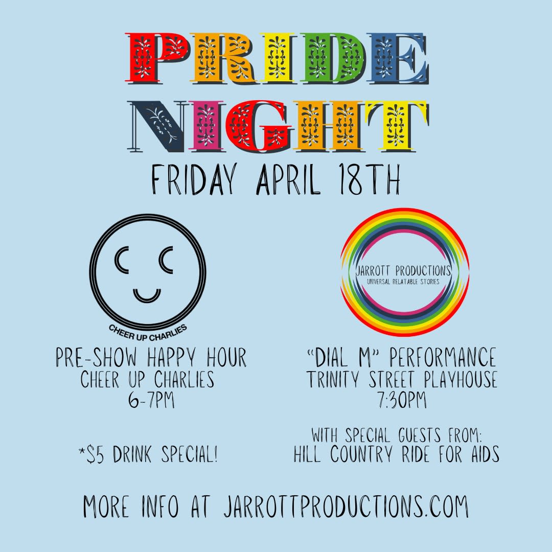 We're excited to team up with our friends at Cheer Up Charlies for a Pre-Show Happy Hour 6-7pm, featuring $5 drink specials. Then, we'll all walk two blocks over to Trinity Street Playhouse for our PRIDE NIGHT performance of DIAL M FOR MURDER at 7:30pm!
