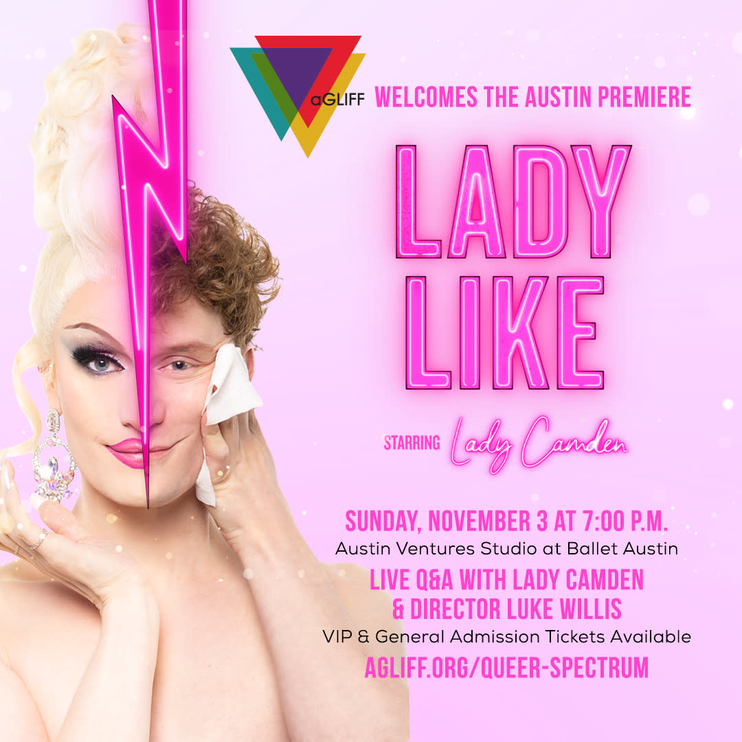 Join our friends at aGLIFF for the Austin Premiere of LADY LIKE starring Lady Camden from RuPaul's Drag Race! Sashay to Austin Ventures Studio at Ballet Austin on Sun, Nov 3 at 7:00 p.m. or go VIP and add a pre-film reception with Lady Camden before the movie! Tickets and info can be found at agliff.org/queer-spectrum.