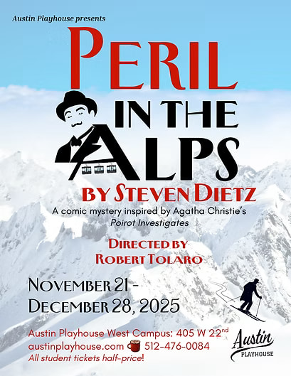 Bella Duveen has mysteriously vanished! Newlyweds Captain Hastings and Dulcinea Devenish (Bella’s twin sister) call upon their old friend, the incomparable Hercule Poirot, to uncover the truth. But Poirot soon discovers uncanny parallels between Bella’s disappearance and a recent case, hinting at a larger, more tangled scheme. Following the trail of clues to the snow-capped Alps, Poirot and Hastings find themselves caught in a web of eccentric suspects, where even the great detective may finally meet his match. Inspired by Agatha Christie’s Poirot Investigates, six actors bring dozens of colorful characters to life in this clever, fast-paced, and diabolically funny mystery. Running through December 28! Pride Night: Friday, December 5