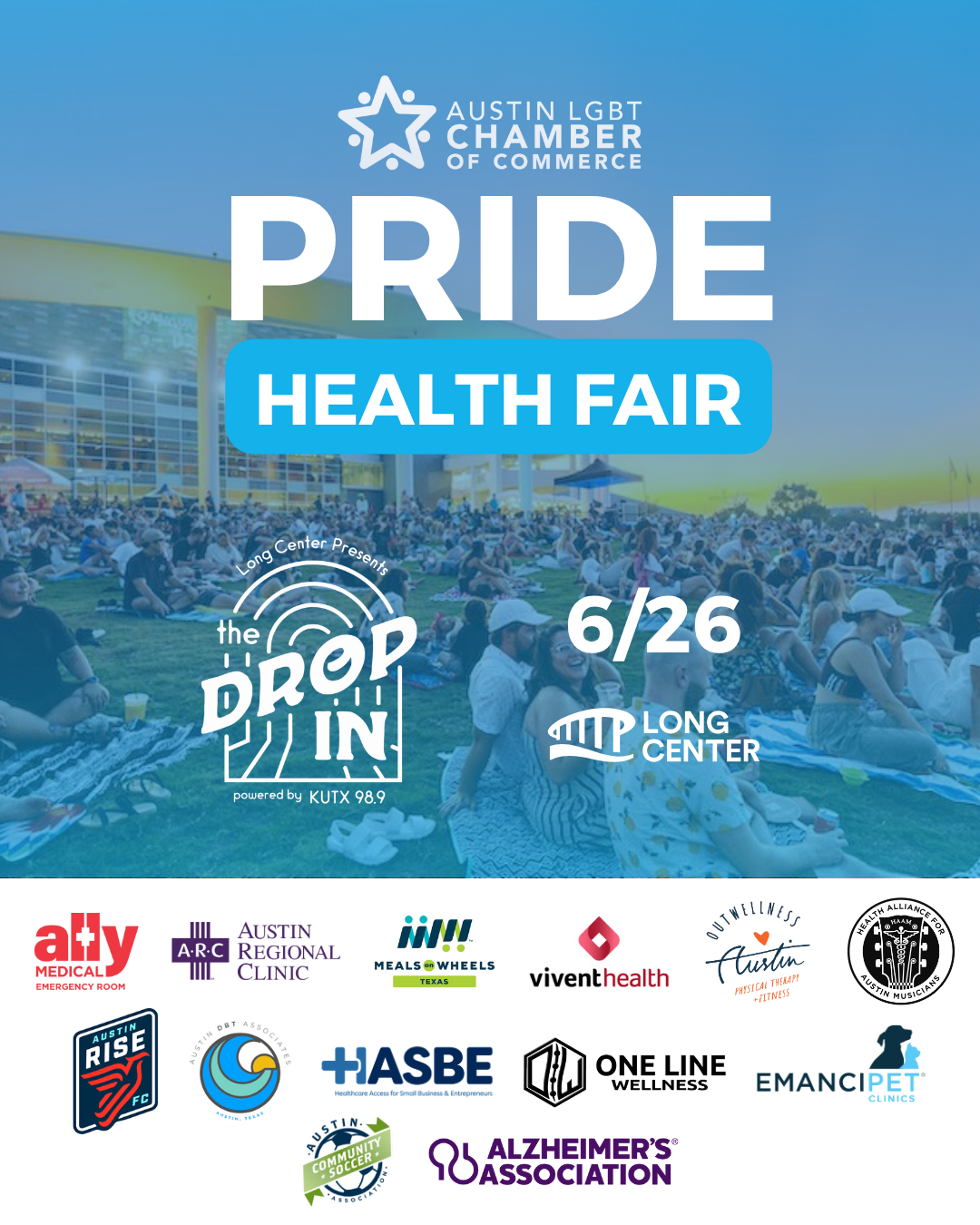 Join the Austin LGBT Chamber of Commerce’s Health & Wellness Committee on Wednesday, June 26th at the iconic Long Center for a special Pride in Health Fair during The Drop-In, Austin’s beloved free outdoor concert series!