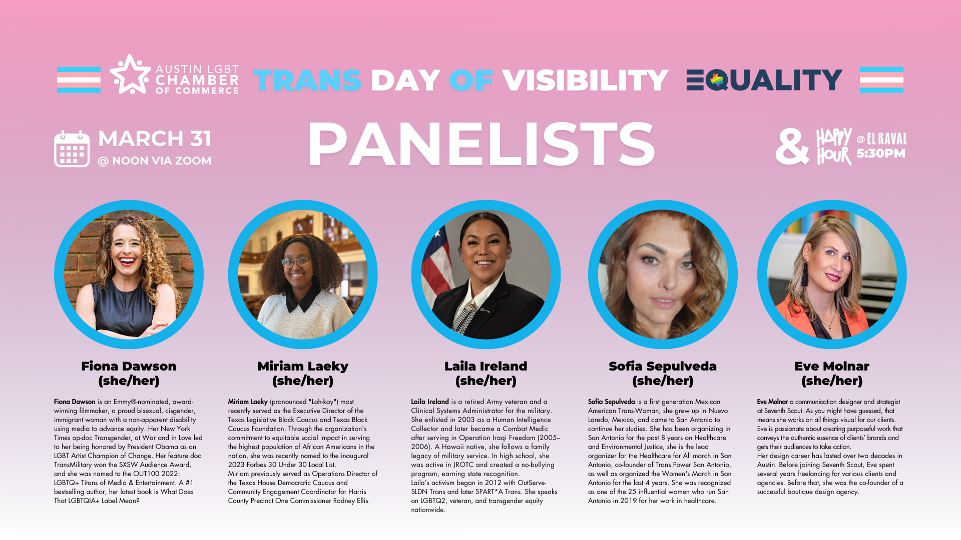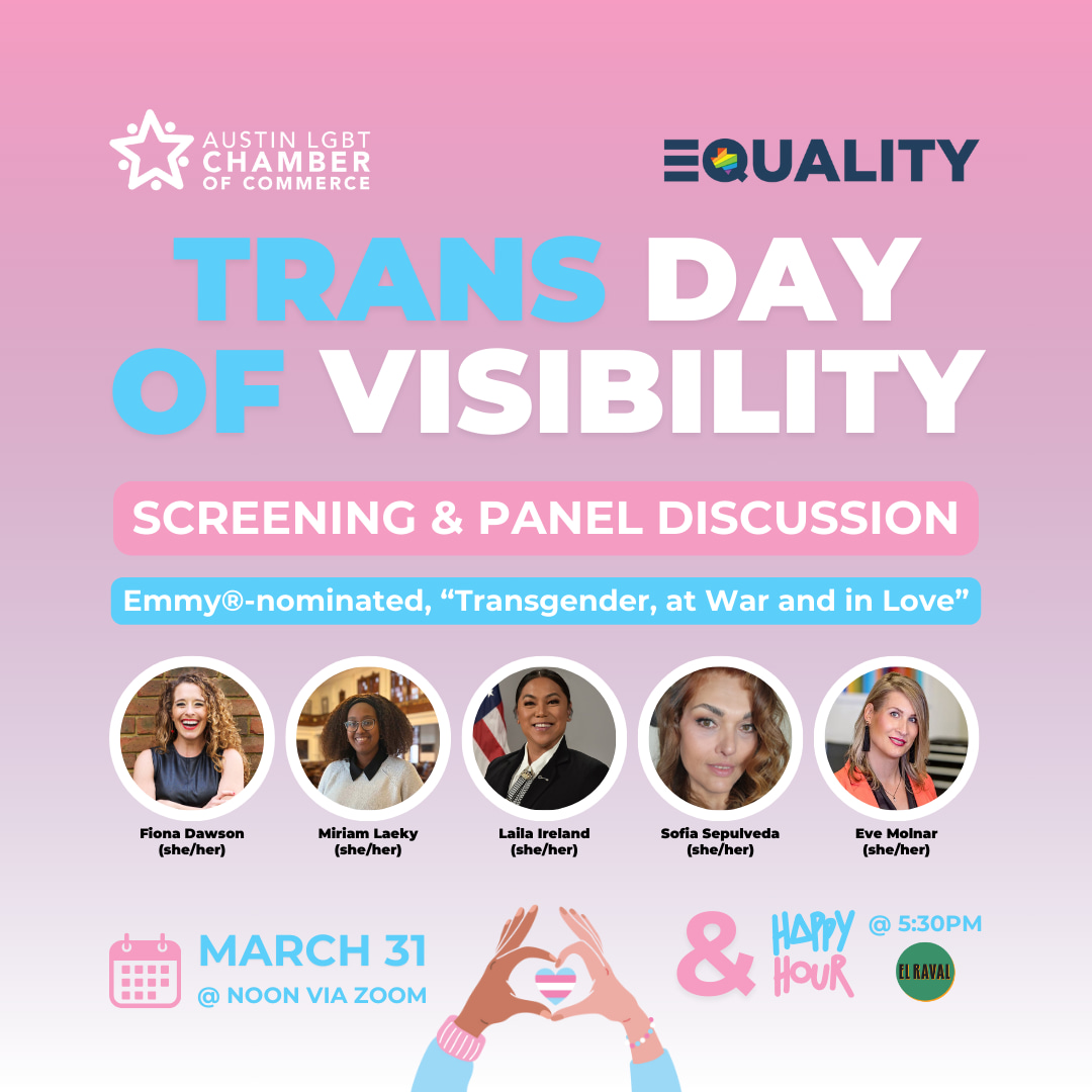 The Austin LGBT Chamber of Commerce and Equality Texas invite you to join us for a special virtual event on Monday, March 31, in honor of Trans Day of Visibility (TDOV). 🏳️⚧️